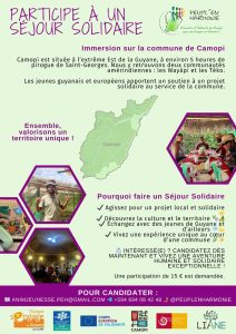 Du 24 mai au 6 juin, embarque pour une aventure unique à Camopi ! Participe à un échange interculturel entre jeunes de Guyane et d’Europe autour de la culture, des richesses locales et des métiers d’avenir. Une occasion de découvrir, d’apprendre et de s’engager dans un projet solidaire au cœur de l’Amazonie. On t’attend nombreux pour cette expérience inoubliable !